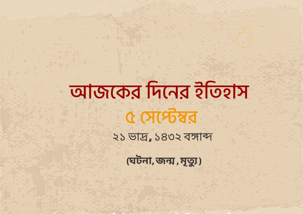 বিশ্ব ও বাংলাদেশের ইতিহাসে এই দিনে ঘটে যাওয়া উল্লেখযোগ্য ঘটনাবলি, জন্ম ও মৃত্যু, এবং বাংলাদেশি সাহিত্য, বিজ্ঞান ও রাজনীতি সংক্রান্ত গুরুত্বপূর্ণ তথ্য নিচে তুলে ধরা হলো: আজকের দিনের (৫ সেপ্টেম্বর) ইতিহাস – বিশ্বপ্রেক্ষাপট বিখ্যাত ব্যক্তি – জন্ম ও মৃত্যু জন্ম: মৃত্যু: বাংলাদেশের প্রেক্ষাপট – সাহিত্য, বিজ্ঞান, রাজনীতি সাহিত্য ও বিজ্ঞান রাজনীতি ও মুক্তিযুদ্ধ: